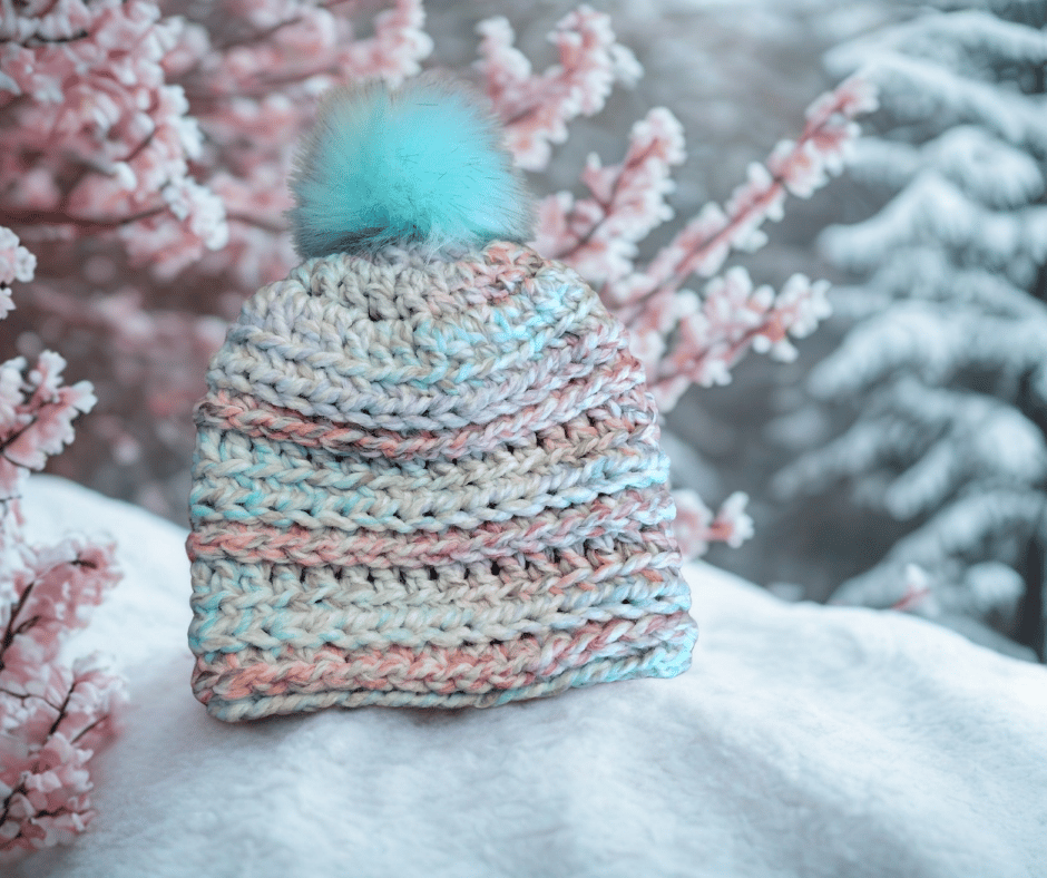 Pictured with an aqua pom. All Spool & Skein hats are customizable with or without poms. Poms are interchangeable- buy as recommended by the designer, choose your preferred color or add extra poms to your order to switch up the look.