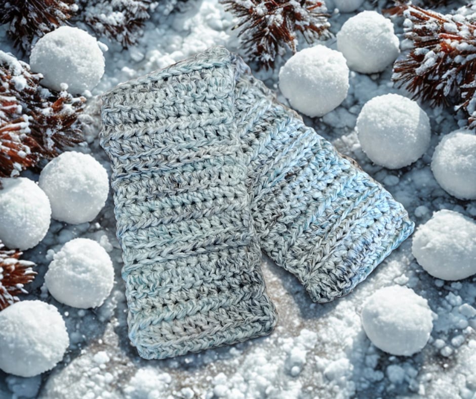 A chunky hat in cool, icy blue, accented with earthy tones like bark brown, deep navy, soft green, and light neutral tones. The colors blend like weathered sea glass smoothed by the shore, creating a serene, coastal-inspired look. Warm, calm, and beautifully unique—no two are exactly alike.