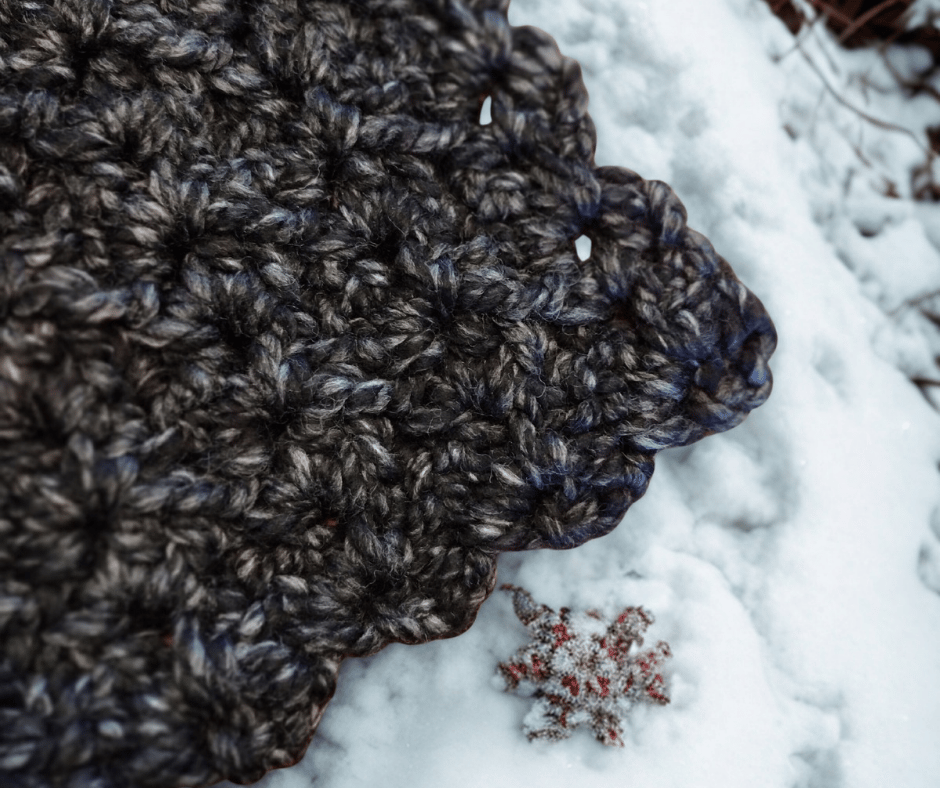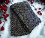 A soft, chunky scarf in deep charcoal, threaded with subtle silver highlights. The decorative scalloped edging adds a touch of elegance, giving the scarf a dressy, refined look while keeping it warm and cozy. Perfect for layering over casual or more polished outfits, each piece has gentle variations that make it uniquely charming.
