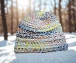 A chunky hat in powder blue, woven with gentle swirls of flamingo pink, lemon yellow, bright orange, and deep navy. The airy, dreamy palette evokes the playful magic of a dreamcatcher, adding a touch of light and magic to chilly days. Cozy and whimsical, each hat has its own subtle variations, making it uniquely charming.
